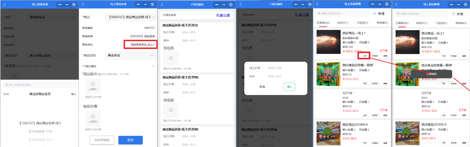 一小程序线上商城功能 1.商户线上商城功能步骤 1.1创建一个线下商品资料 在微商户小程序中,点击商品申请,新增商品信息,并保存 如果想要创建的线上商品包含子母码,则需在创建线下商品时设置子母码属性  1.2商品申请列表查看 未审核状态下的商品可修改和复制,已审核的商品可复制。 1.3商户提交商品申请后,商管可在微用户或后台进行审核。 商管需点击修改,对该商品的扣点进行填写 确认商品资料无误后,点击审核。  1.4商户通过微商户创建线上商品,填写基本信息后,点击提交 一个线下商品可创建多个线上商品 此处线上商品申请和调整的审核功能可在后台综合数据维护中配置(1:自动审核,其他值:手动审核) 如配置自动审核,则商品直接变为已审核状态 如配置手动审核,则需要商管通过微用户小程序-线上商品维护进行审核   1.5商品上架后,顾客可在微会员查看到上架商品的信息,可进行购买和退货。  1.6商户可在微商户小程序查看订单状态  2.自营线上商城功能步骤 2.1后台创建线下商品资料并审核  2.2创建线上店铺 商场管理在后台线上店铺申请维护中,新增一个线上店铺,并审核。  2.3自营店人员进入微用户小程序,可进行线上商品的申请 目前根据数据权限的勾选,自营店人员进入微用户后只可看到自己的线上店铺的商品 管理人员根据数据权限勾选可查看到所有的线上店铺的商品  2.4新增商品后,可在列表上查看,点击详情可对商品进行调整与提交。 回到工作台,点击上下架管理功能,对选中的商品进行上架。  2.5商品上架成功后,可在微会员小程序上查看购买该商品  2.6购买成功后,可查看订单,再次查看商品可看到月销量增加库存减少